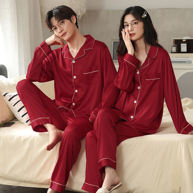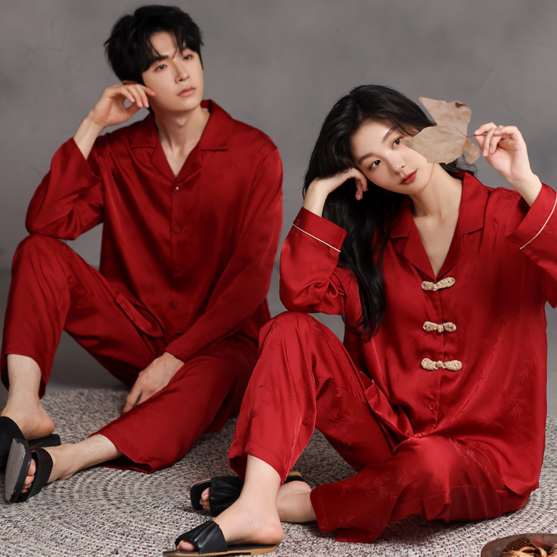 カップルパジャマ赤い氷糸春秋長袖女性結婚新婚本命年赤いシルク家庭服セット