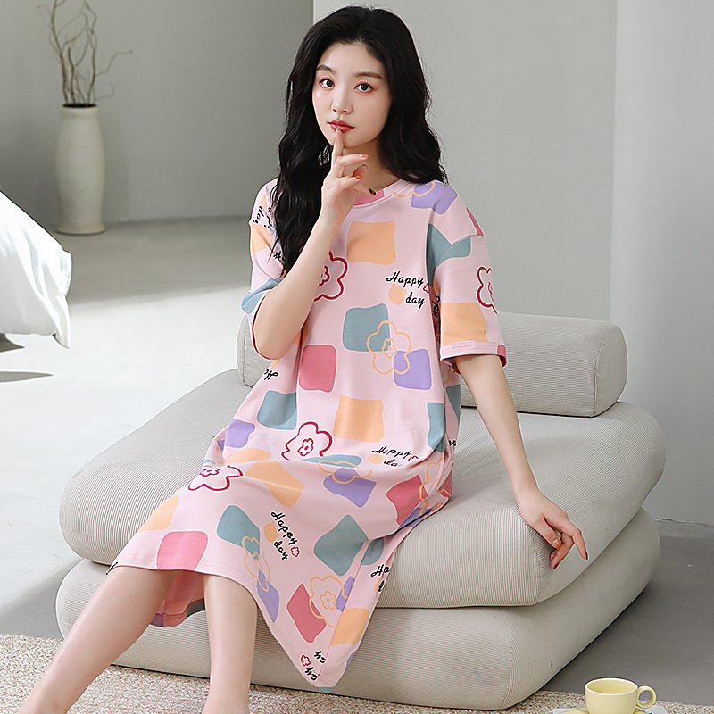 純綿のパジャマの女性の夏の新型のアニメの少女の綿のパジャマの夏の丸首の頭のゆったりした大きいサイズのワンピース