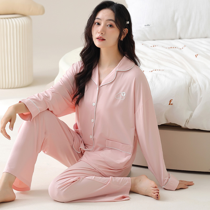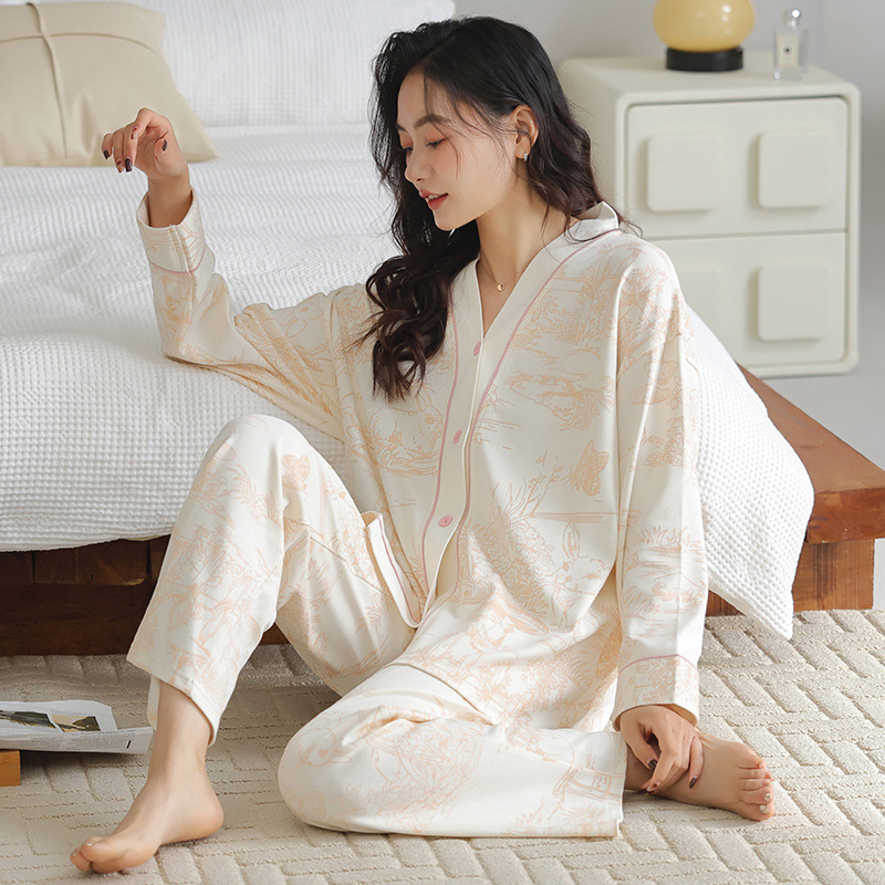 純綿のパジャマの女性春秋の新型の襟をめくる長袖のカーディガンの大きいサイズの女性は全綿の部屋の服のスーツを着ることができます。
