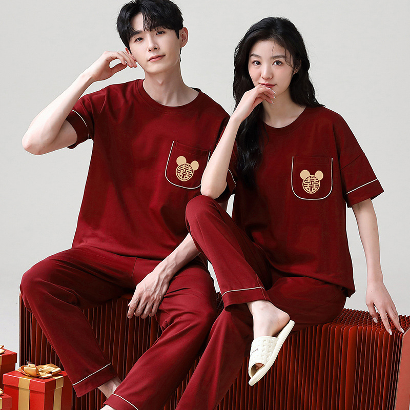春夏結婚カップルパジャマ新婚夏純綿半袖長ズボン赤おめでたい本命年ホームウェアセット