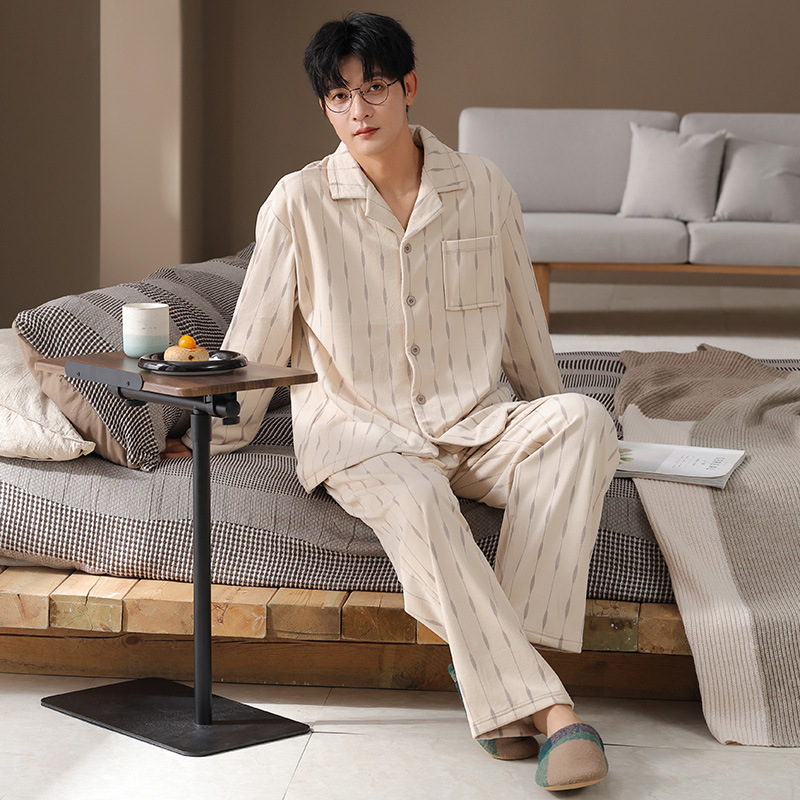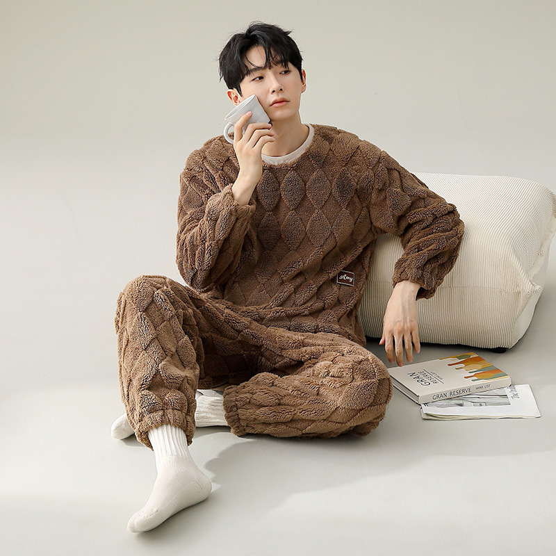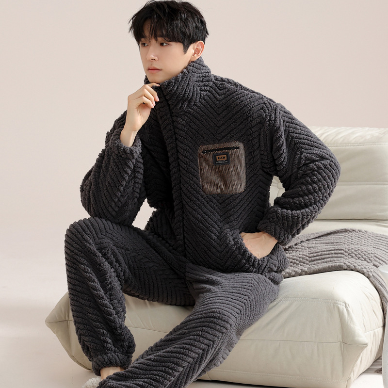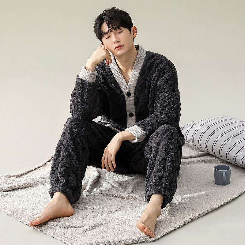 男性は冬に厚いベルベット保温パジャマ海島パイル家服秋冬タイプの襟折りカーディガンのパジャマ男