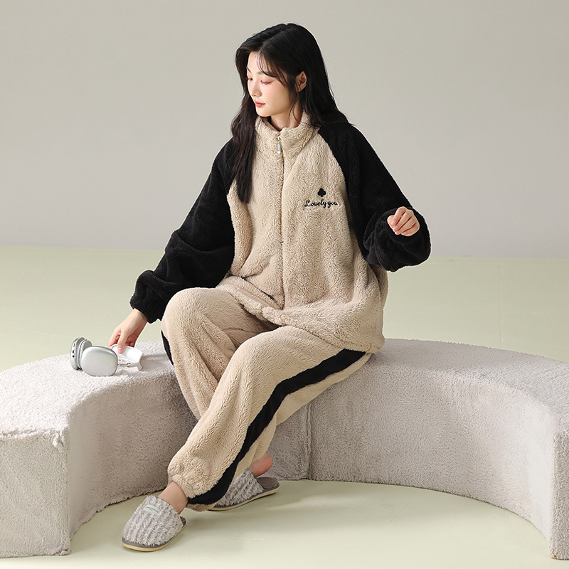 フランネルのカップルのパジャマの女性は秋冬に暖かくて、襟のファスナーの家の服のサンゴの毛を厚くしてスーツを着ることができます。