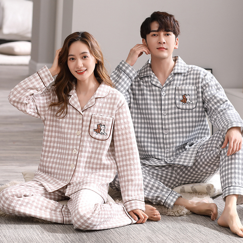 カップルのパジャマ秋冬純綿の中の女性の襟の格子は太って大きいサイズの男性をプラスして綿の家の服を着ることができます。