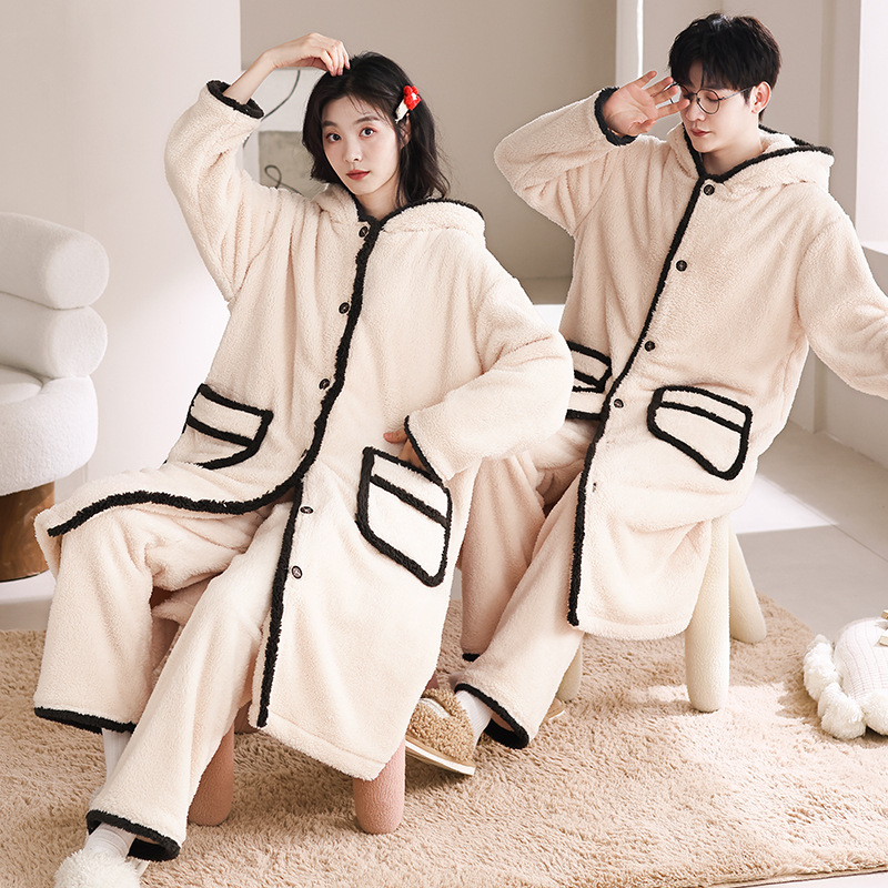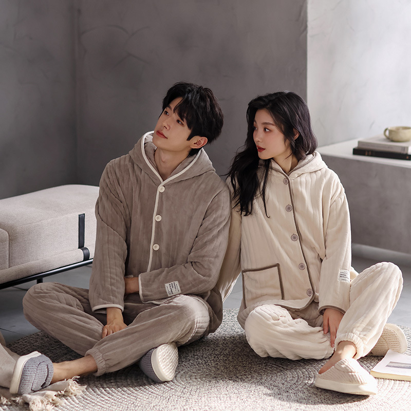 カップルのパジャマ冬のサンゴのベルベットは、新しい男女の帽子付きの帽子付きのフランネルの家の服を着ることができます