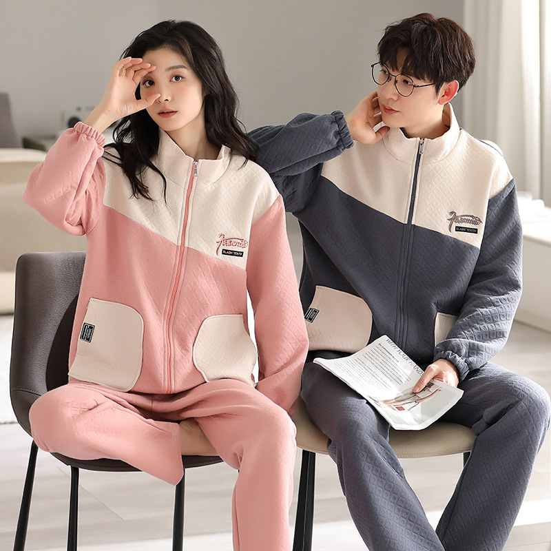 空気綿の長袖の厚いカップルのパジャマの女性の秋冬の純綿のサンドイッチの保温の男性のファスナーの薄い綿のスーツ