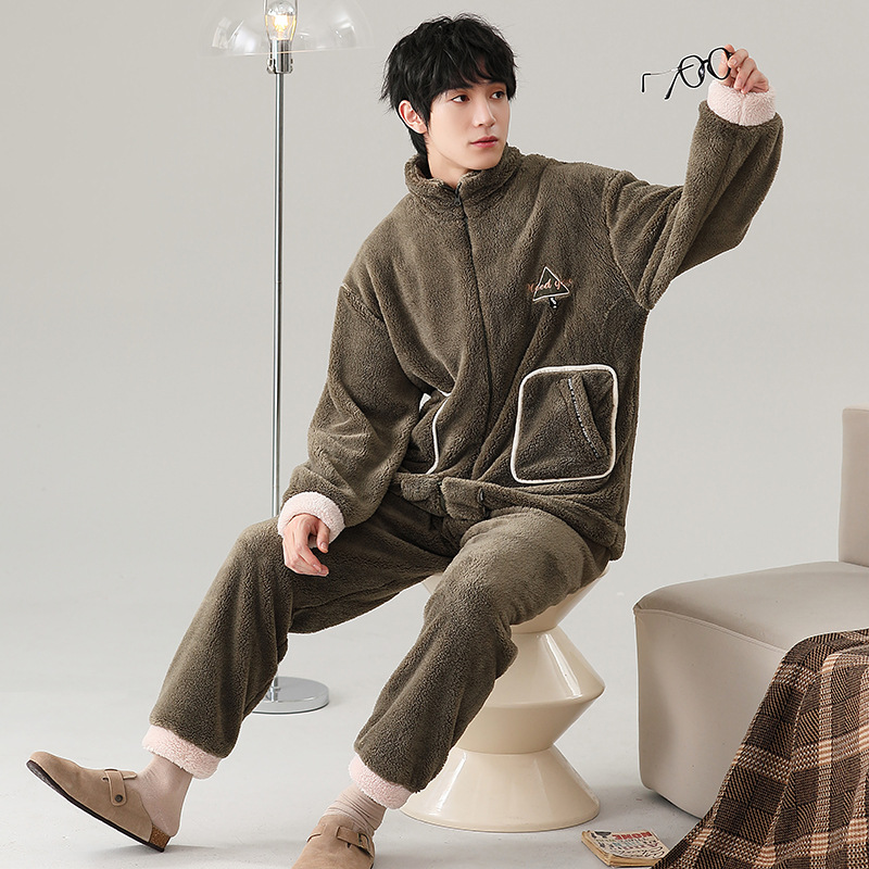 ベルベットパジャマ男性秋冬フランネルベルベット厚手保温スタンドカラージッパー軽いスポーツ風カジュアルホームウェア