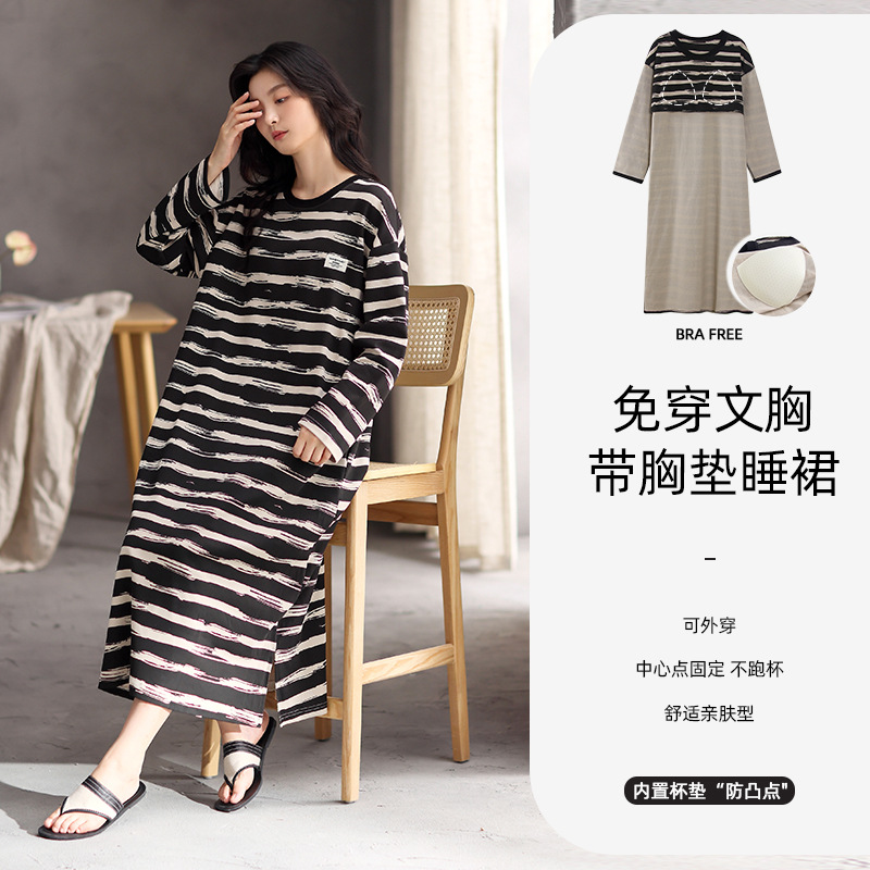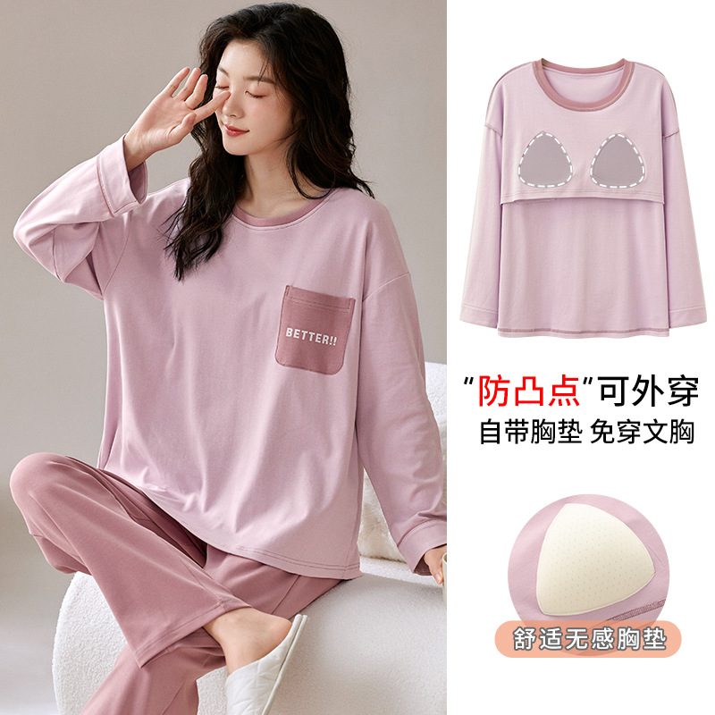 胸パッド付きパジャマ女性春秋純綿女性丸首カバー