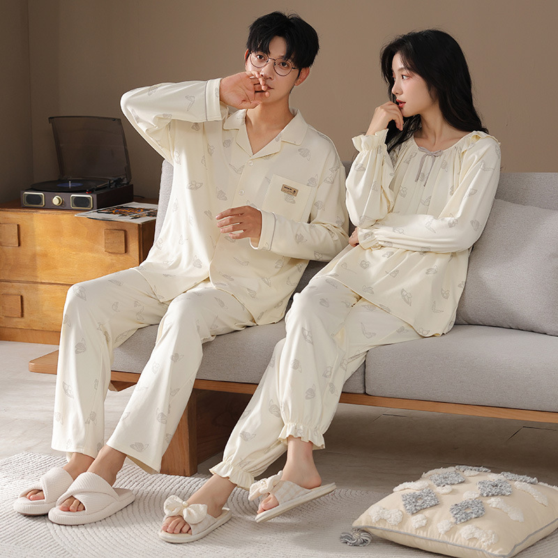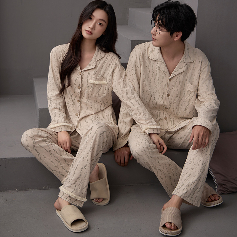 カップルパジャマ春秋プルオーバー綿長袖長ズボン一男一女高級感カーディガン純綿ホームウェア外着可
