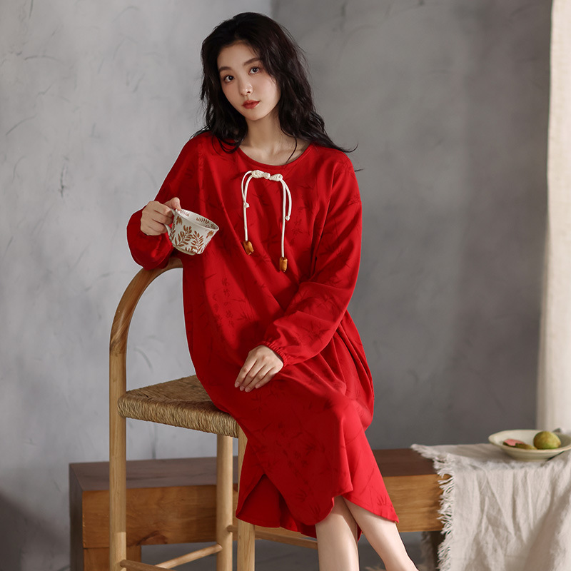 新商品のワンピースのパジャマの女性春秋の純綿の長袖の大きい赤色の本命の年の中国風の綿のパジャマの家の服