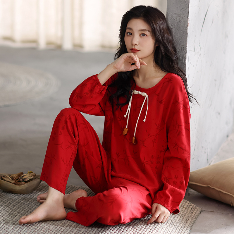 新しい中国式のパジャマの女性のタイプの春秋の新型の長袖の家庭服の本命の年の大きい赤色の結婚の中国風のスーツ