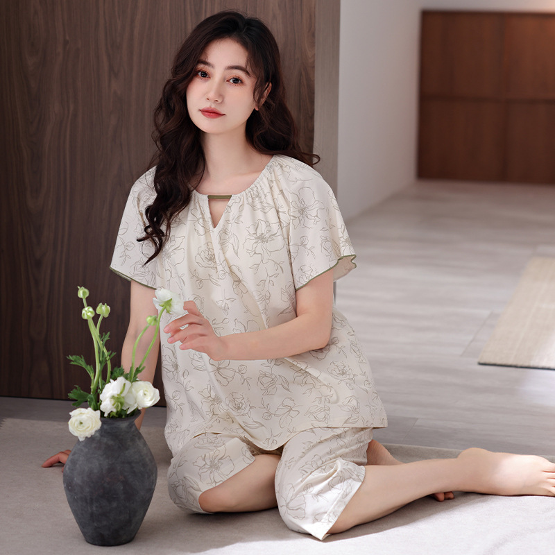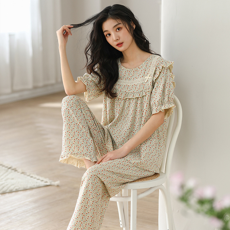 パジャマ女性夏純綿半袖七分ズボンセット甘い田園風夏タイプは小柄な家庭服を着ることができる