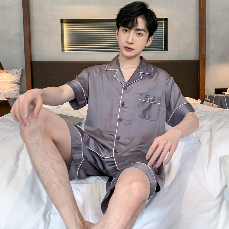 パジャマ男氷糸折り襟半袖夏の薄い色のシルクの家の服の夏の半ズボンの2つのセット