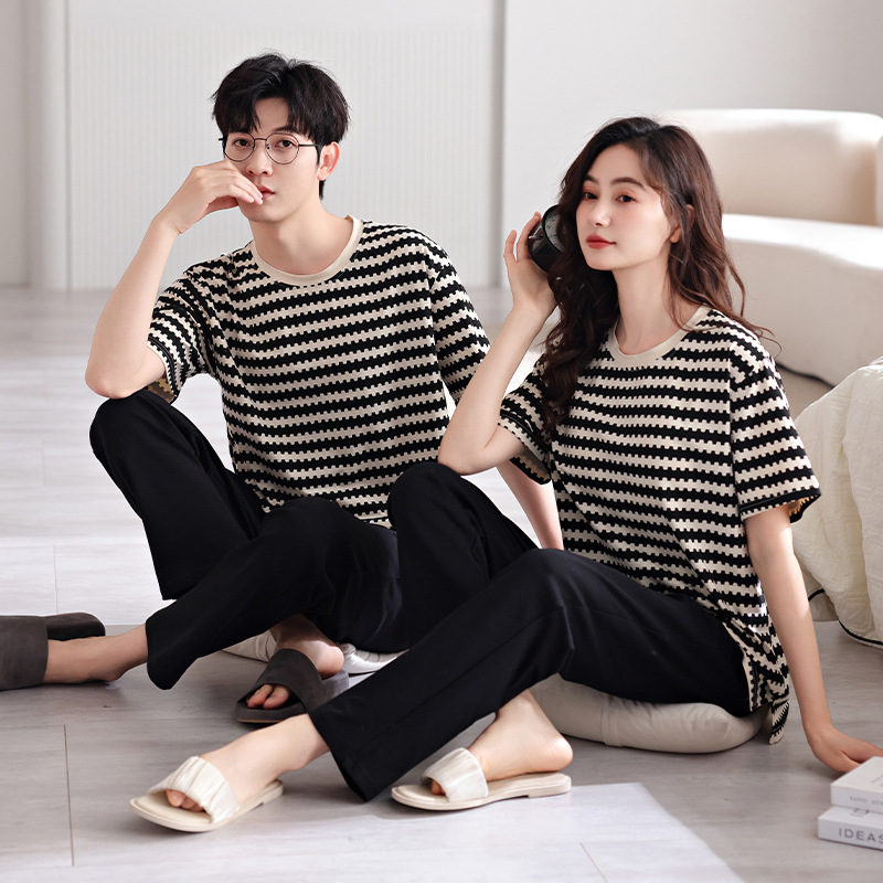 夏のストレッチ綿カップルパジャマ半袖綿の長ズボンのストライプは胸のパッドを持っています。