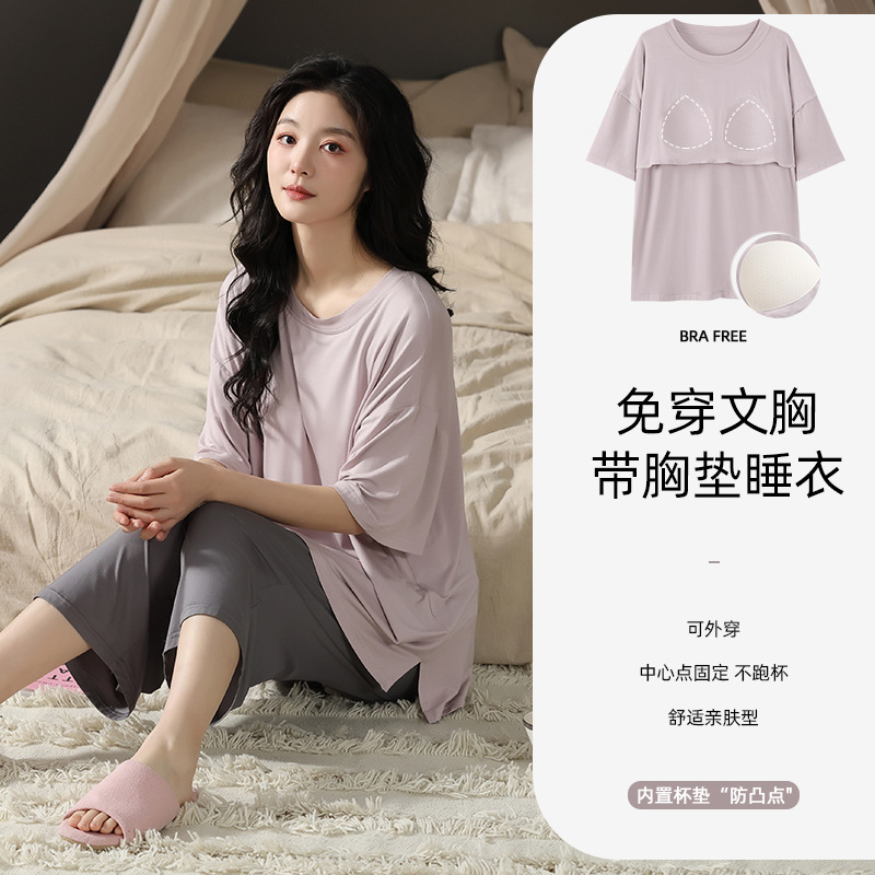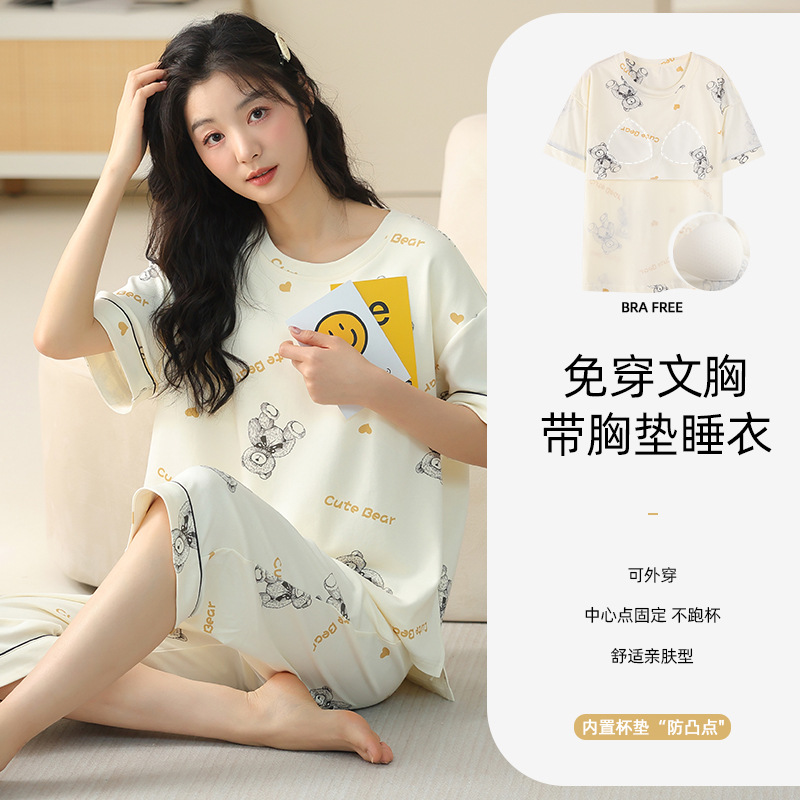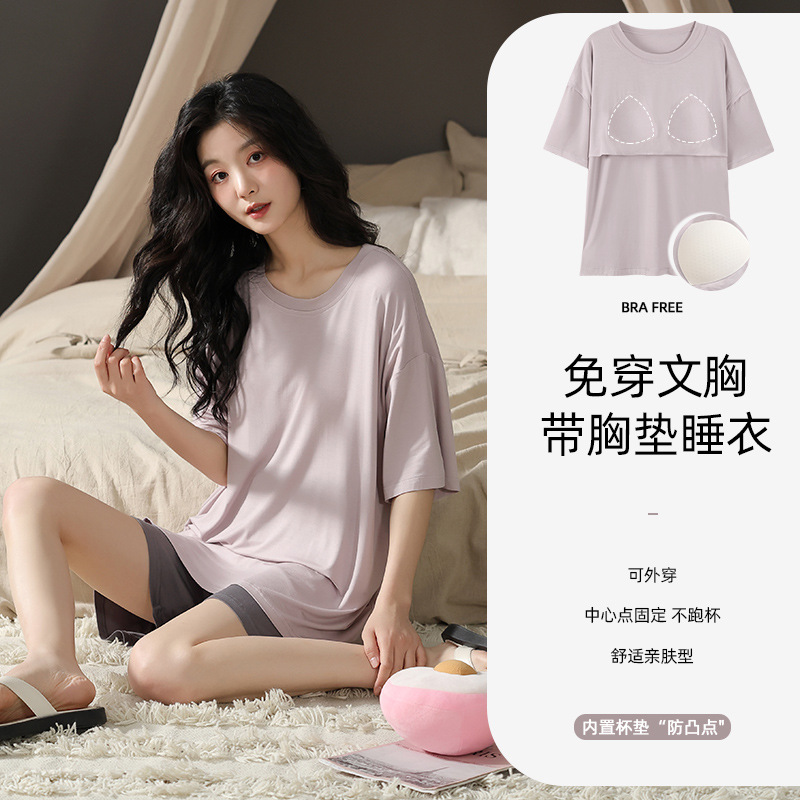 モーダルパジャマ女性の夏は胸パッド付きの薄い半袖の丸首で、女性の夏の家の服を着ることができます。