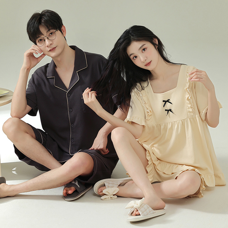 カップルパジャマ夏純綿半袖ワッフル新商品お姫様風純綿ホームウェア外着可セット