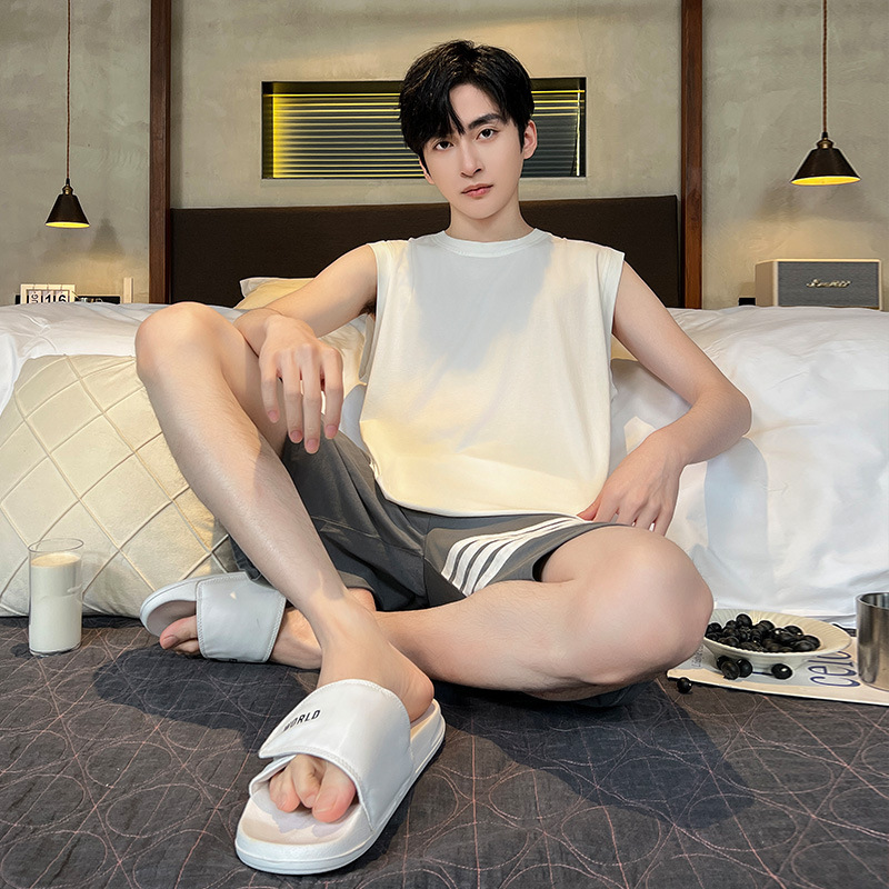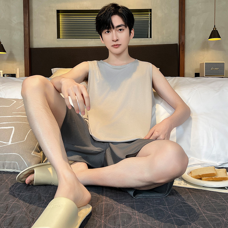 モーダルパジャマ男性夏涼しいノースリーブベスト男性青少年カン肩純色ホームウェア半ズボンセット