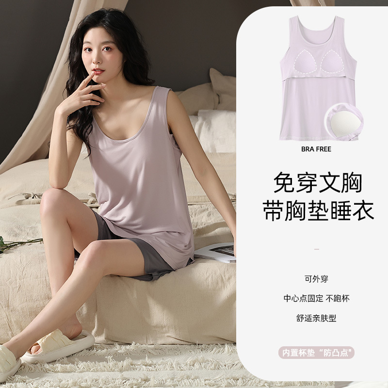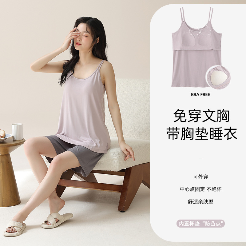 モーダルのパジャマ女性の夏のショーツのストラップのベストの薄いタイプの涼しい胸のパッドは純色の家の服を着ることができます。