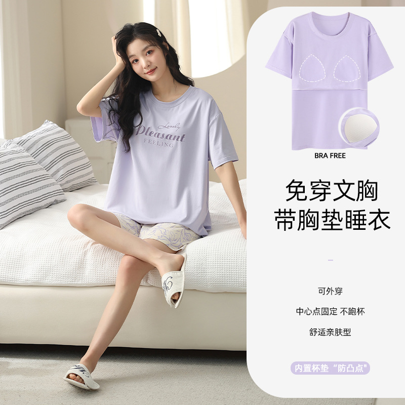 パジャマに胸パッド付きの夏の半袖半ズボンの薄い綿の家の服の女性の夏のタイプは2つのセットを着ることができます。