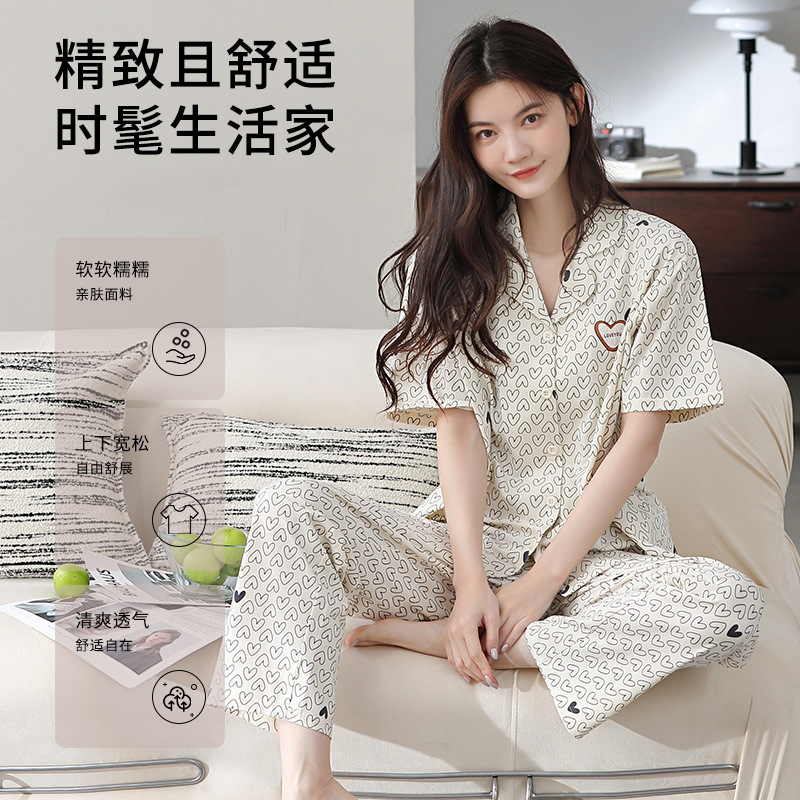 【7a抗菌】パジャマ女性夏の涼感ラックコットンカーディガン半袖長ズボン純綿ルームウェアセット