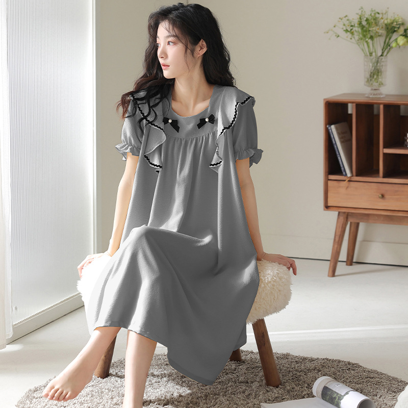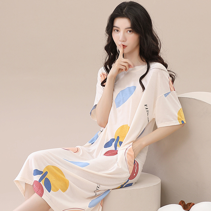氷糸モーデール寝スカート女性夏半袖パジャマ薄い夏ミディアムラウンドネック女性ホームウェア