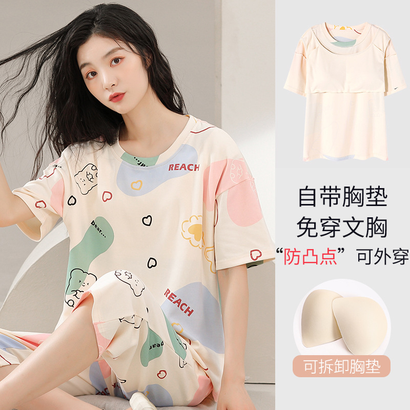 胸パッド付き半袖パジャマ女性丸首カバー少女大サイズ