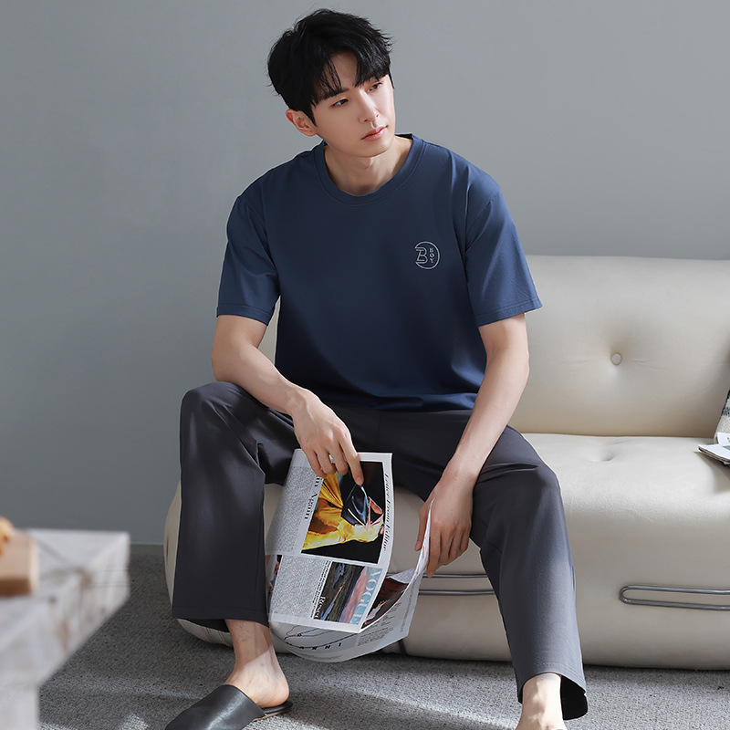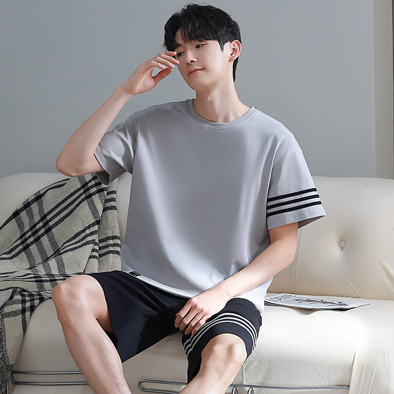 男性パジャマ夏の半袖の薄い綿の青少年の大きいサイズのカジュアルなゆったりした家庭服のスーツは外で着ることができます。