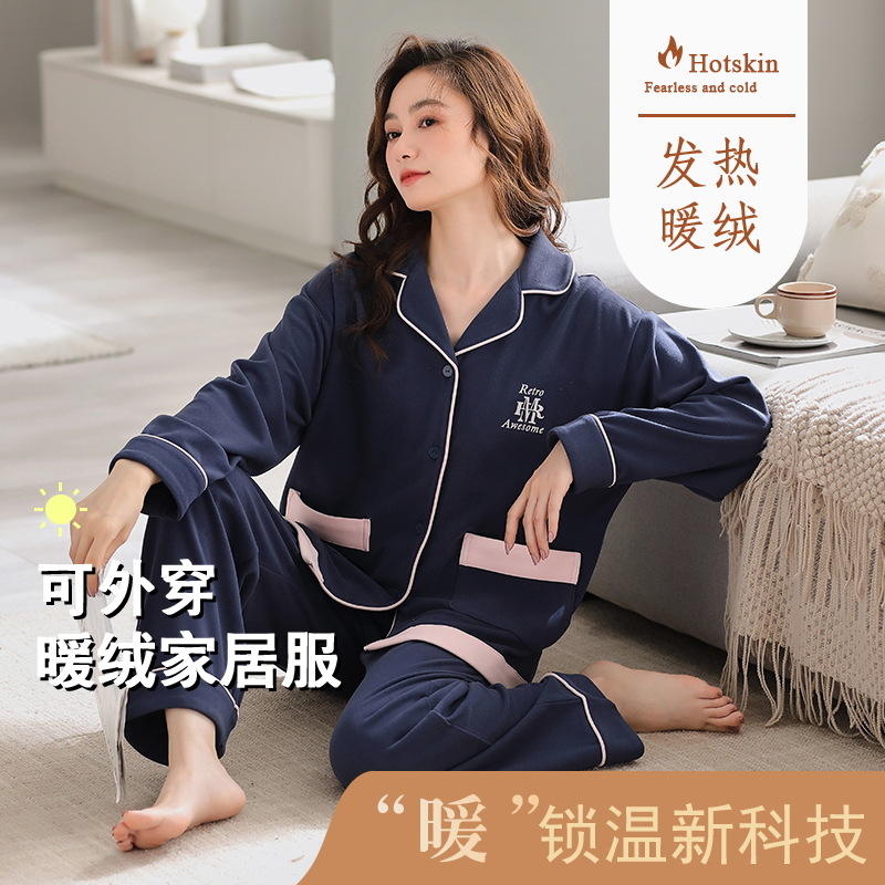 パジャマの女性春秋の長袖の徳の絨毯の蓄熱の丸首の頭の女性は外で発熱して保温する部屋の服のスーツを着ることができます。