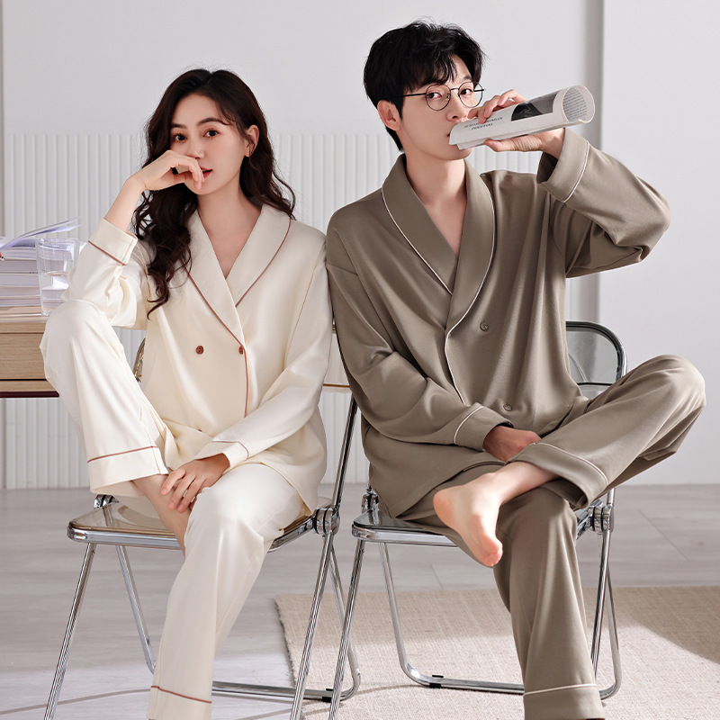 韓国のカップルのパジャマの夏の新型の女性の半袖の襟のカーディガンの男性の夏のモーダルの涼しい感じの家の服