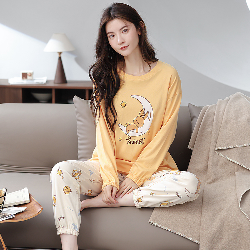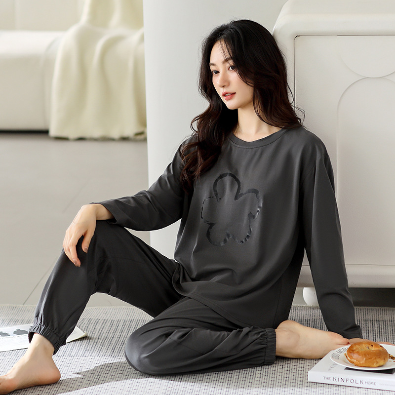 パジャマレディース秋冬新作両面純綿パジャマカジュアル丸襟プルオーバー大きいサイズ春秋ズボンセット
