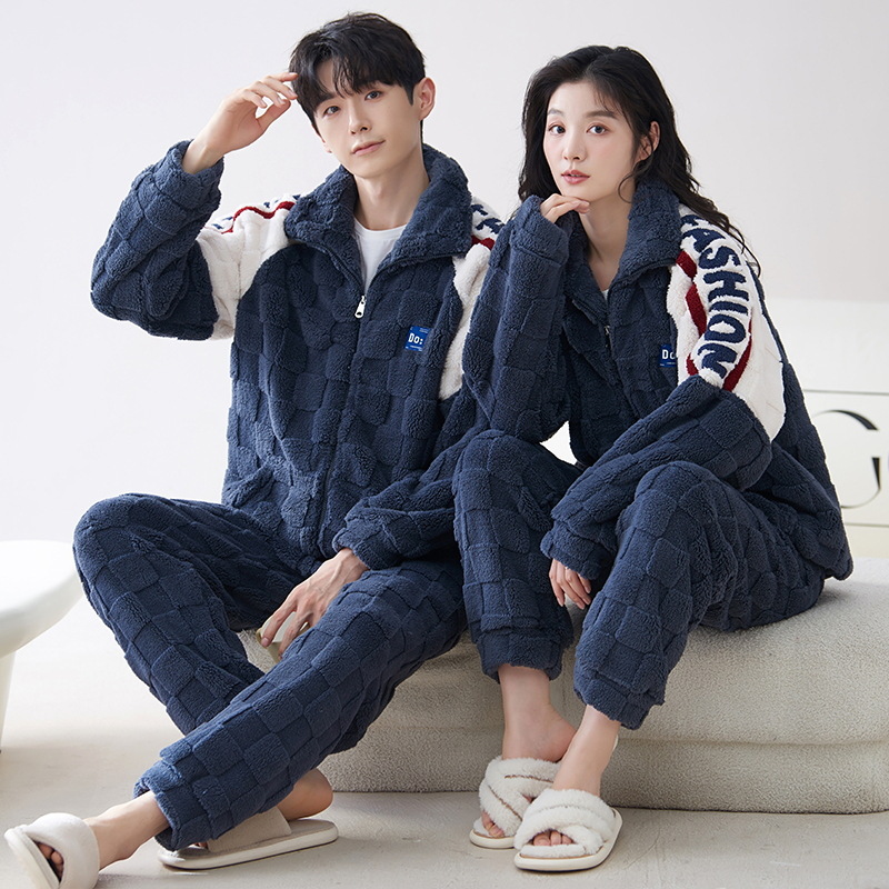 ベルベットのカップルのパジャマ男性は冬にベルベットを厚くして襟のジッパーの新しいフランネルの保温家庭服を作った