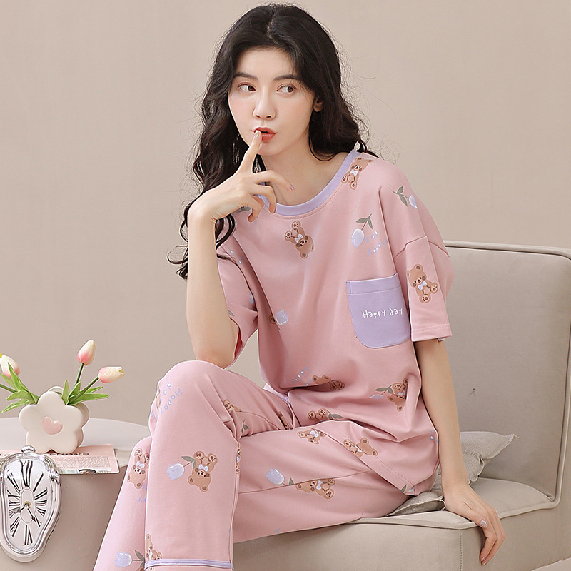 新しいパジャマの女性の夏の純綿の半袖のズボンの春夏の女性は綿の家の服の薄いタイプの2つのセットを着ることができます。