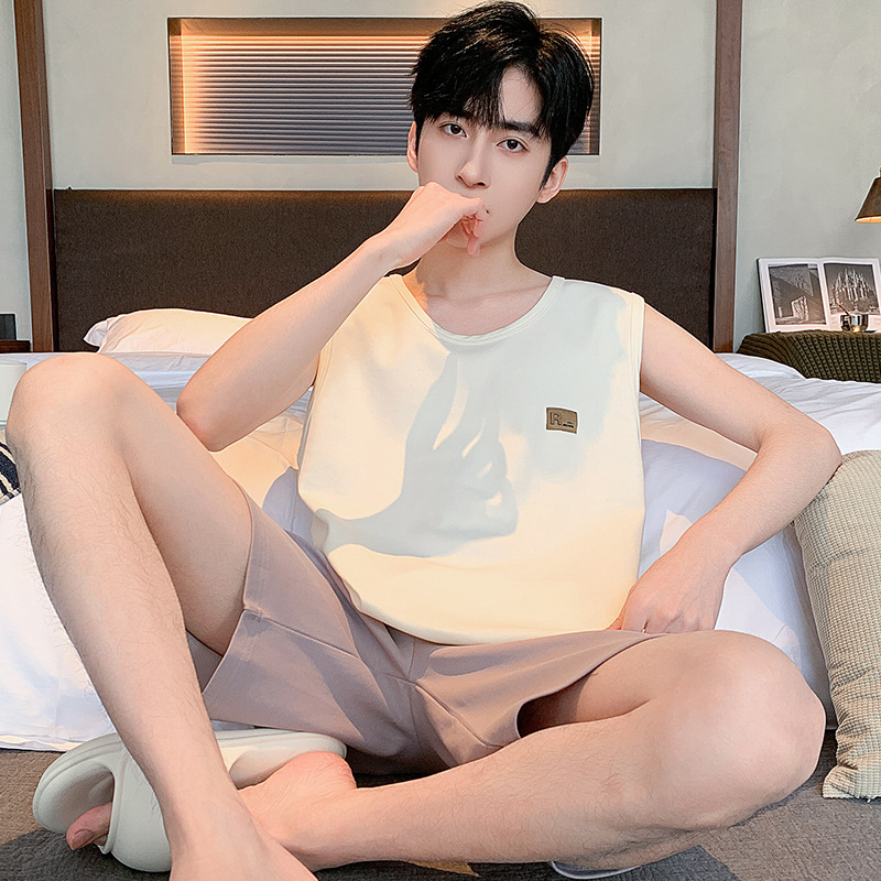 ベスト男性パジャマ夏の純綿の薄い袖なしの男性用の大きいサイズはシンプルで、ショートパンツの家庭服セットを着ることができます。