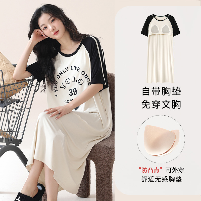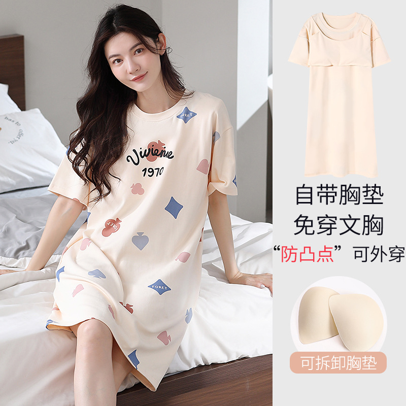 寝ているスカートの女性の夏の純綿は胸のパッドの一体式の半袖を持って家の服の大きいサイズのパジャマの綿のワンピースのスカートを着ることができます。