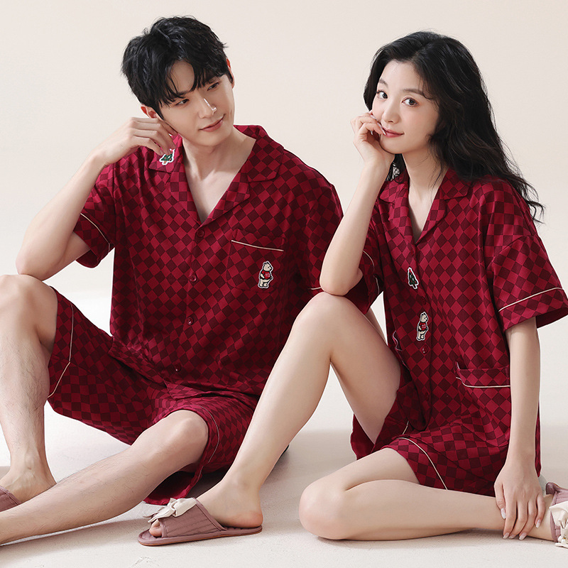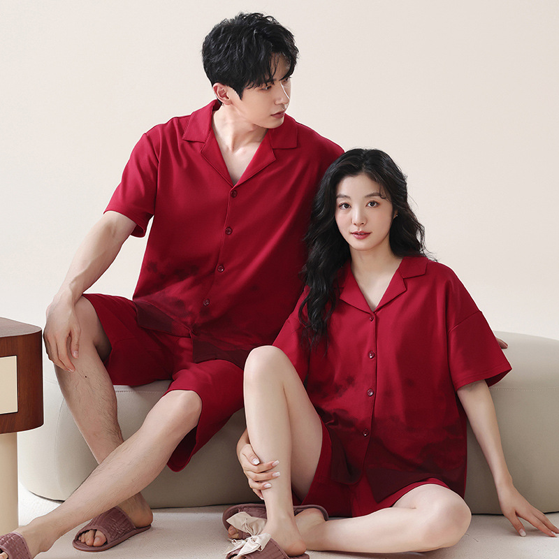 結婚カップルパジャマ夏シルク綿半袖パンツ赤新婚祝い本命年大サイズホームウェア