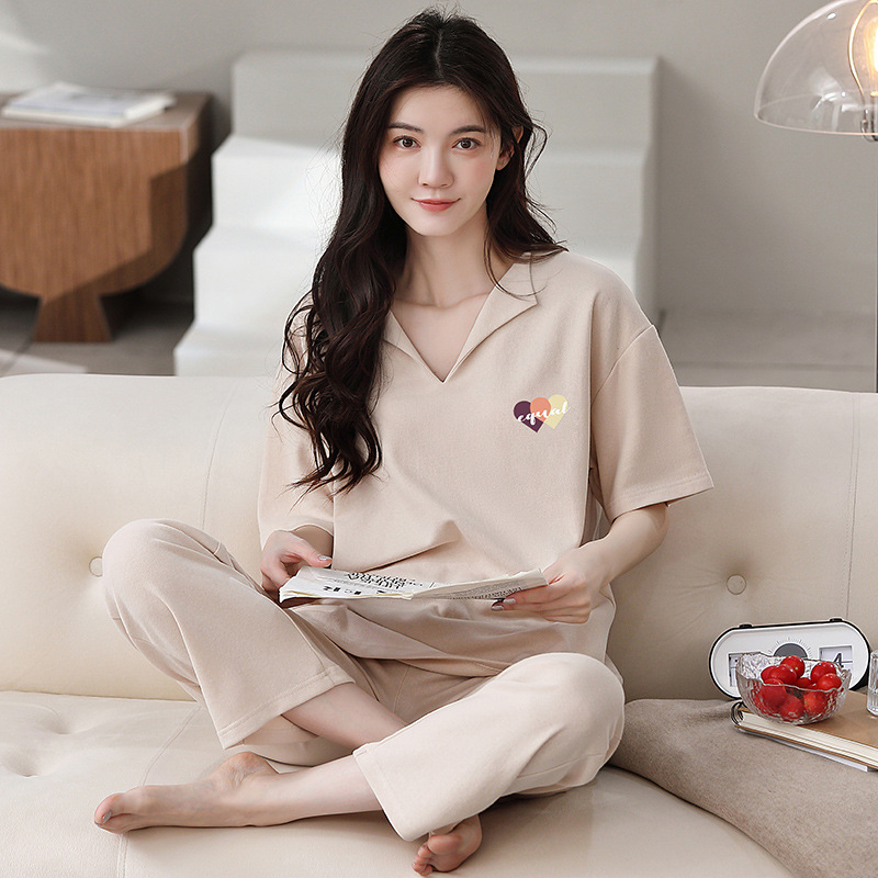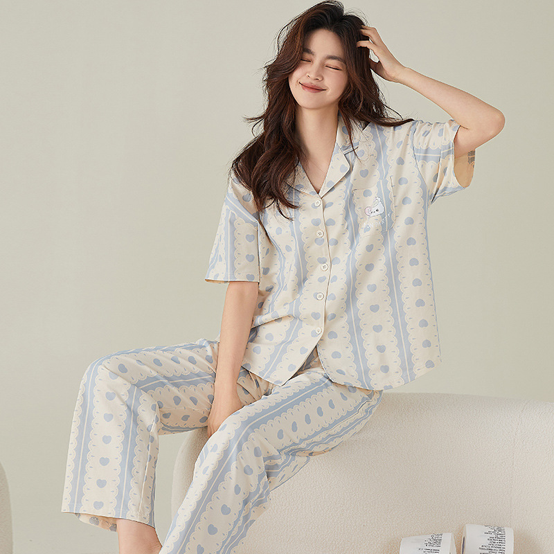 パジャマ女性の夏の純綿丸襟半袖七分ズボン家庭服女性の綿はカジュアルに二点セットを着ることができる