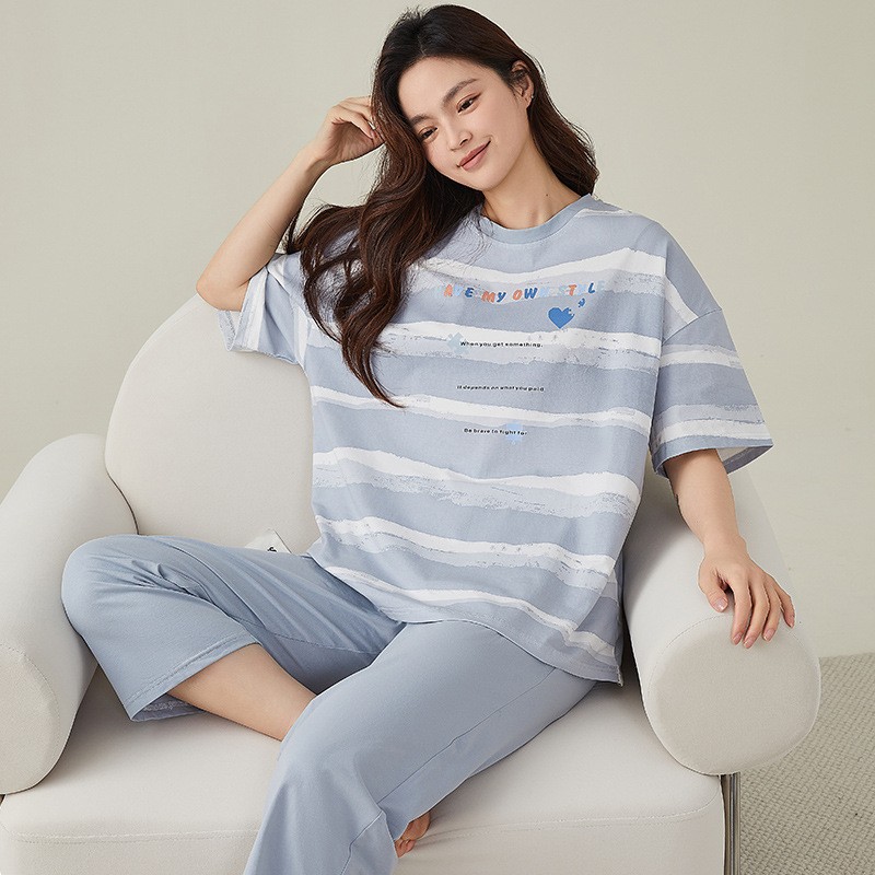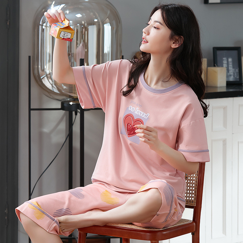 新しいパジャマ女性の夏の純綿半袖は女性の夏の丸首の大きいサイズの7分のズボンの家の服のスーツを着ることができます。