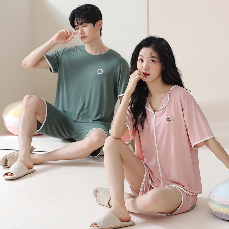 シルク綿パジャマ女性夏半袖冷感胸パッド付き単色大サイズカップルルームウェア