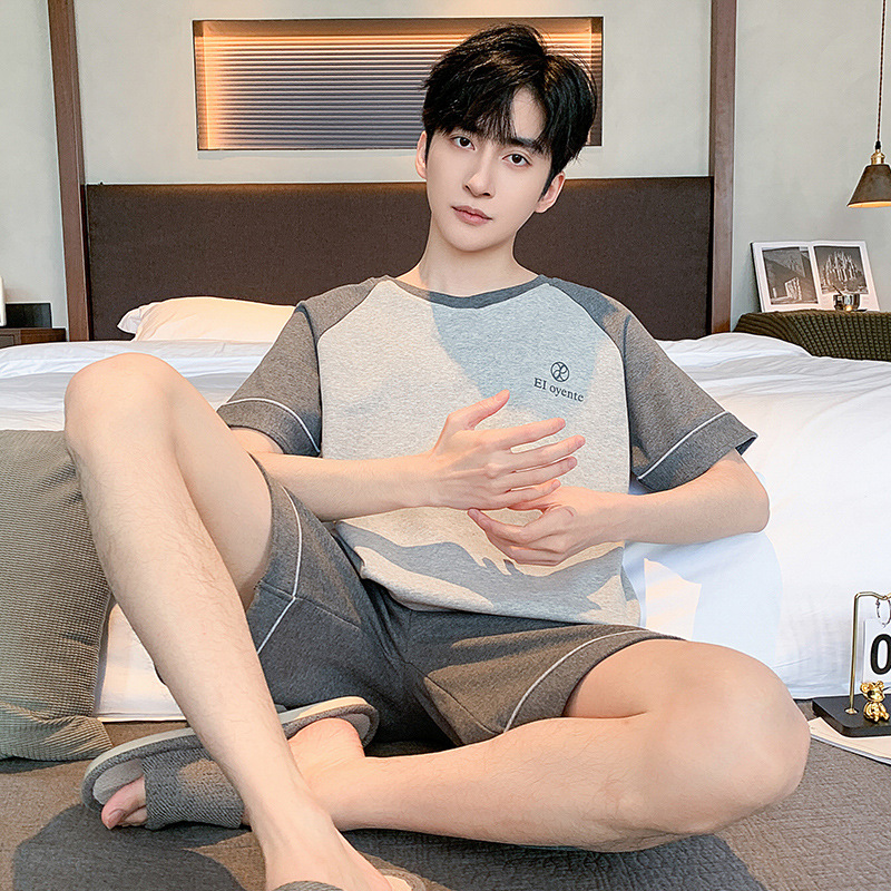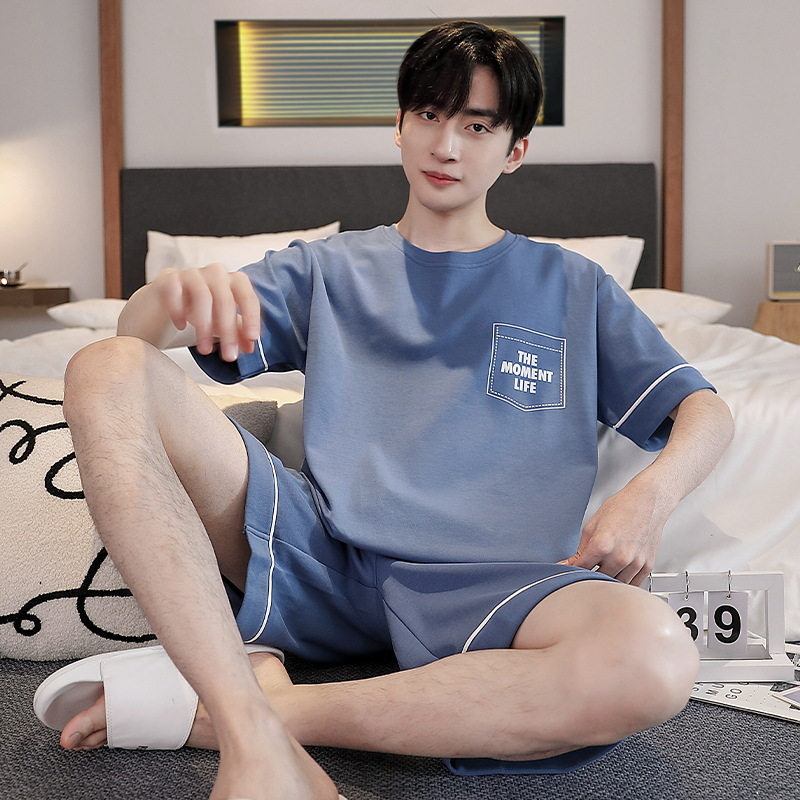 夏の純綿パジャマ男性丸首カジュアルサイズは綿半袖ズボン男性家庭服セットを着ることができる