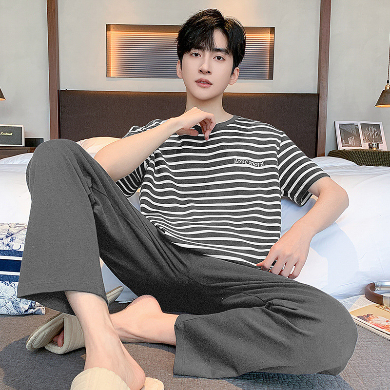 純綿半袖パジャマ男性夏のカジュアルストライプの大きいサイズの軽い運動は綿のズボンの男性の部屋の服を着ることができます。