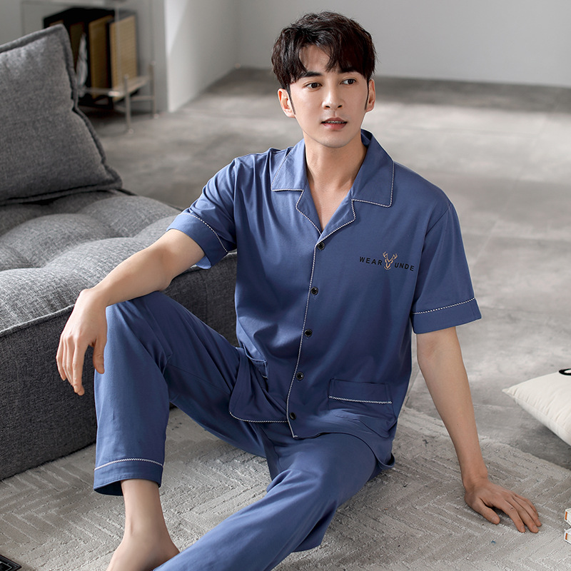 男性の純綿パジャマ夏の薄い襟のカーディガンの大きいサイズは中年のお父さんの半袖のズボンの家の服を着ることができます。