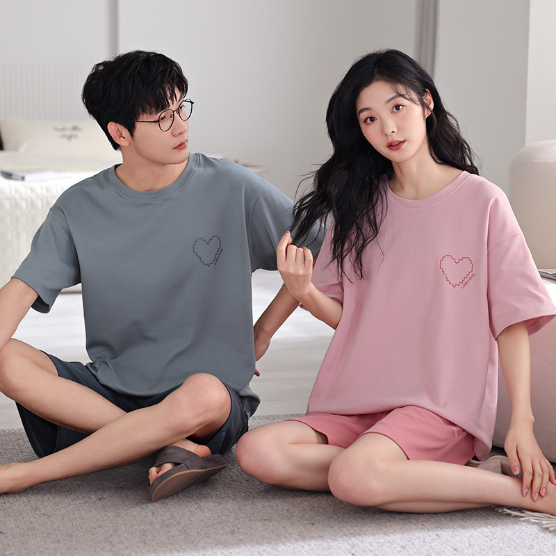 半袖カップルパジャマ夏純綿丸襟純色カジュアル大きいサイズは綿100% ショートパンツ家庭服セットを外着できます。