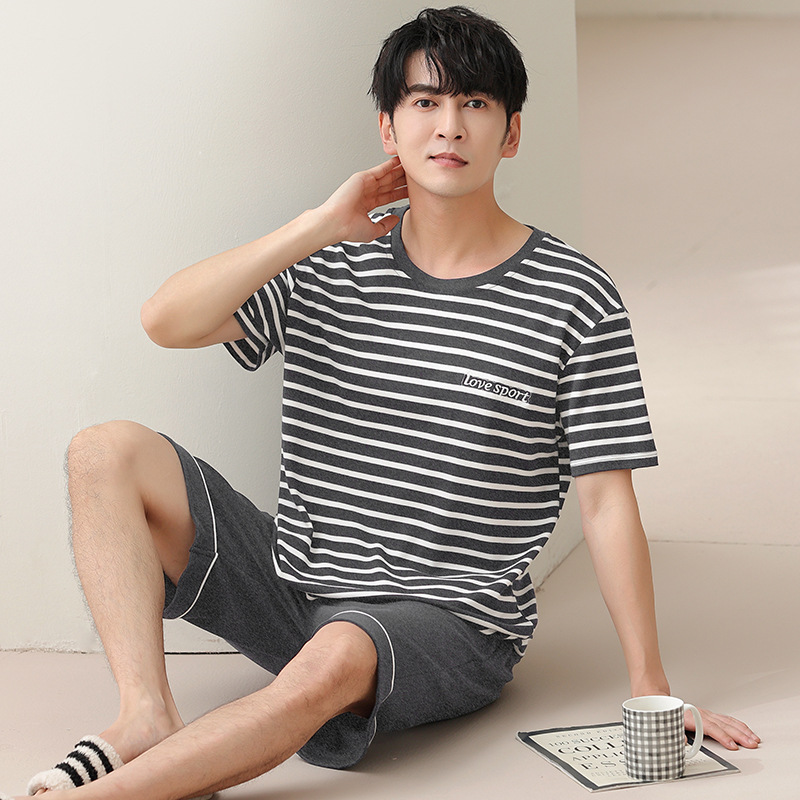 メンズ半袖純綿パジャマ夏新作カジュアル大きいサイズ丸首ストライプ薄い綿100% ホームウェアセット