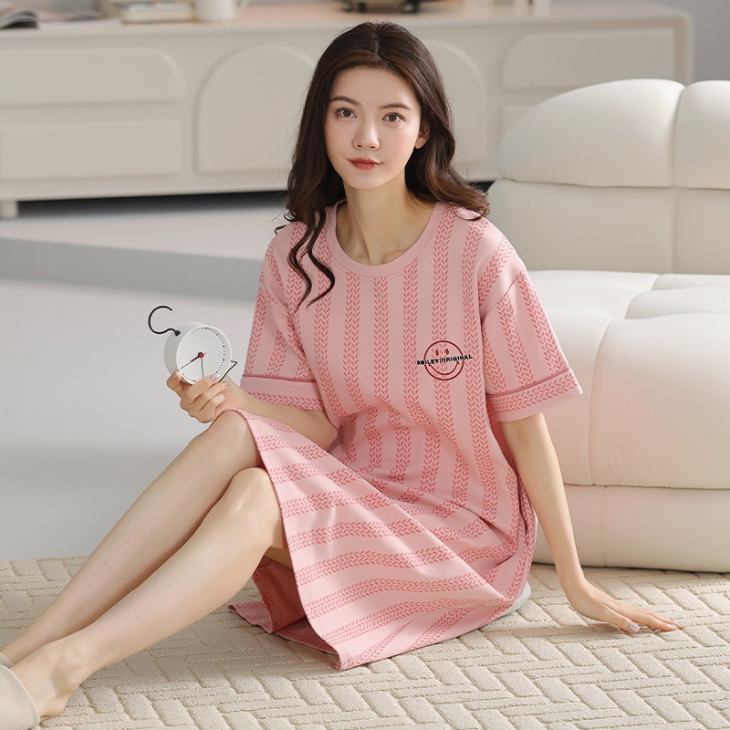 純綿のパジャマの女性の夏の新型の大きいサイズのゆったりした丸首の少女の中で長いスカートのパジャマの綿の半袖のワンピースのスカート