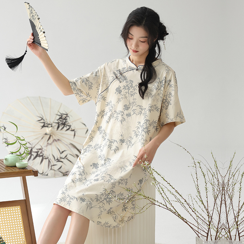 【国風】新中国式パジャマ女性夏プルオーバー綿半袖パジャマ中国風チャイナドレスホームウェアワンピース