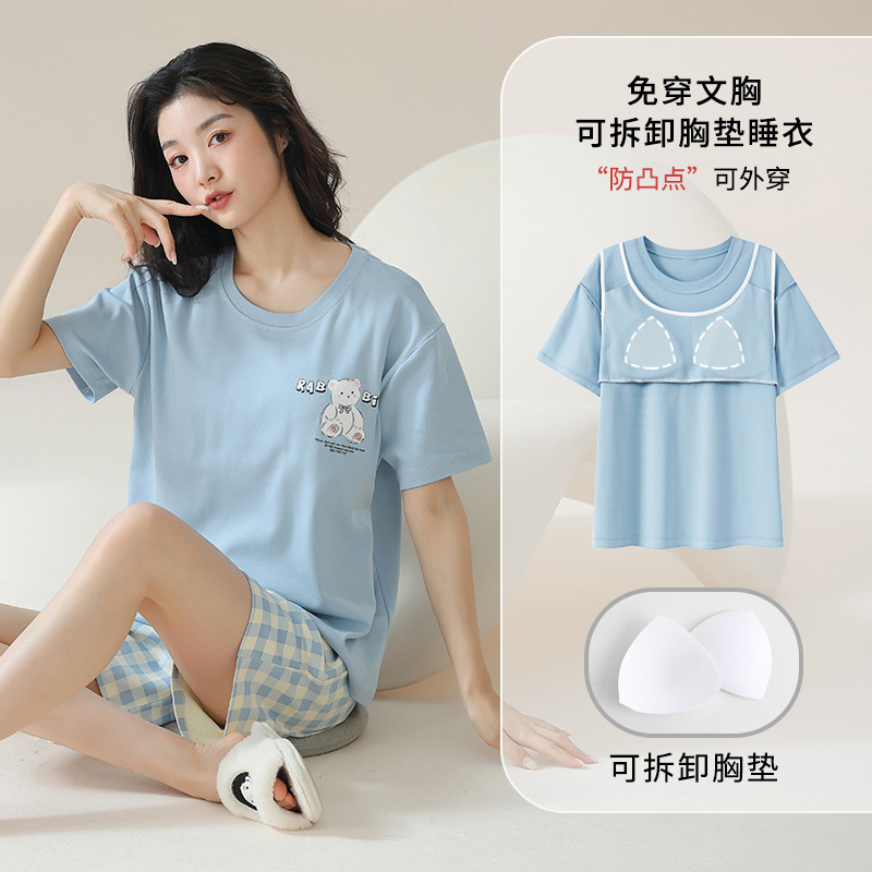 純綿のパジャマの女性の夏の丸首の漫画の少女の学生は胸のパッドを持って綿のショートパンツの部屋の服のスーツを着ることができます。