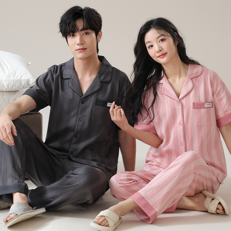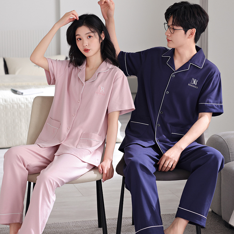 純綿のカップルのパジャマの夏の新型の襟のカーディガンの純色は綿の半袖のズボンの部屋の服のスーツを着ることができます。