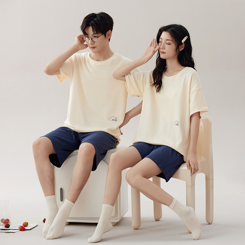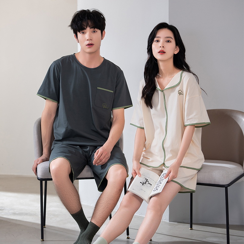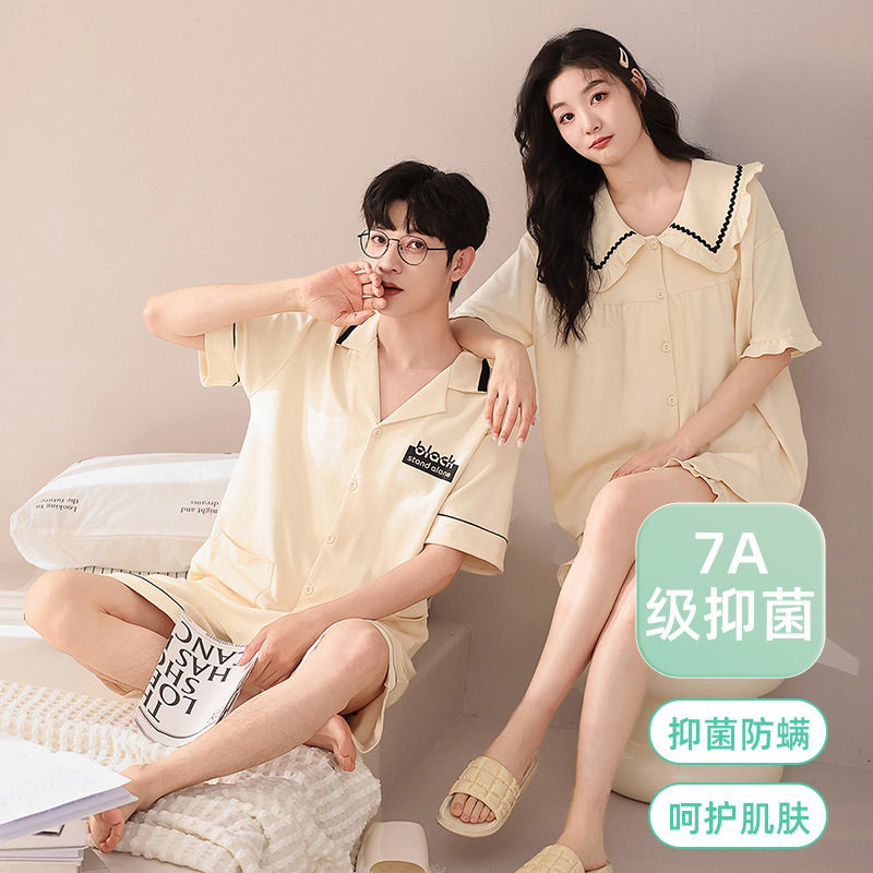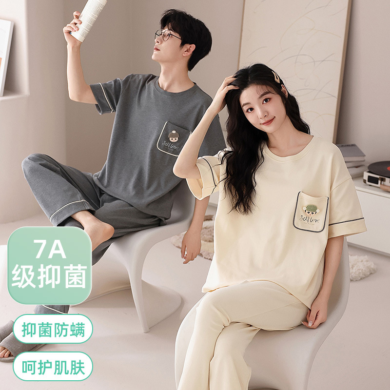 【7a抗菌】夏の新型カップルパジャマ女性純綿純色は薄い綿半袖ホームウェアを着ることができる