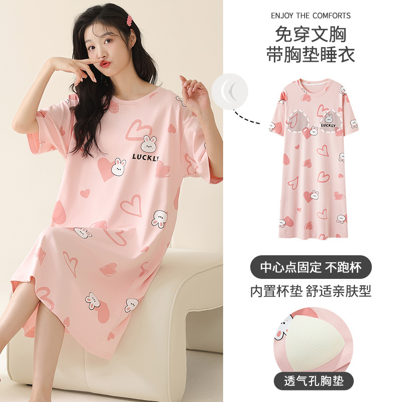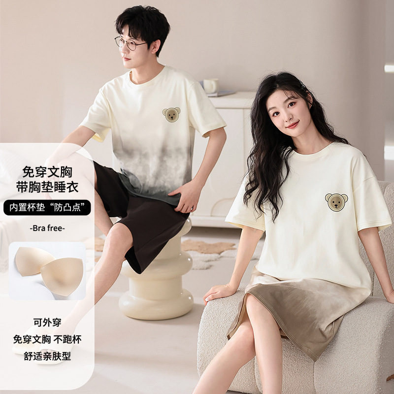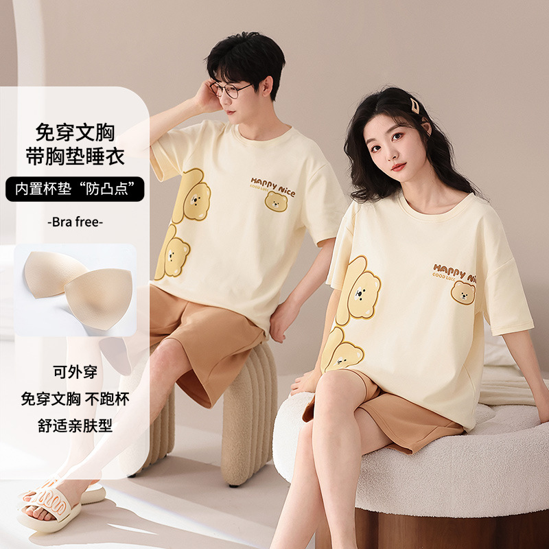全綿の胸パッド付きのパジャマ女性夏の新型半袖のゆったりした大きいサイズは純綿のカップルのパジャマセットを外に着ることができます。