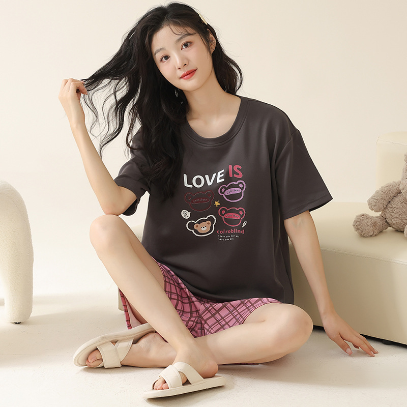 純綿パジャマ女性夏の薄い丸首漫画少女学生は半袖パジャマ綿の家庭服を着ることができる