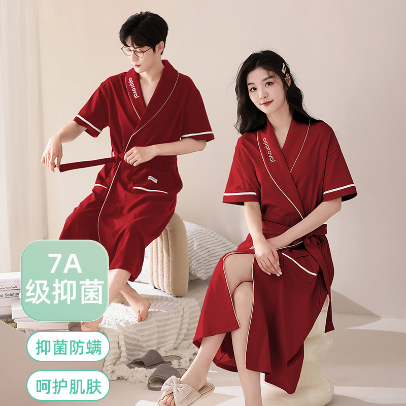【7a抗菌】純綿カップルパジャマ女性夏新作結婚新婚赤い薄い綿のワンピースパジャマ